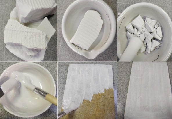 При використанні вогнетривкої обмазки рекомендуємо попередньо її подробити - це пришвидшить процес змішування з водою. У співвідношенні 1:1 - перевести в сметаноподібний стан та промазати плити.Товщину шару покриття плит замовник підбирає індивідуально під свою технологію (тому допускається приготування більш рідкої консистенції) Обмазка добре наноситься та має хороше зчеплення - швидко сохне. Вогнетривку суху суміш можна використовувати як добавку для виготовлення вогнетривких елементів та підставок в піч.